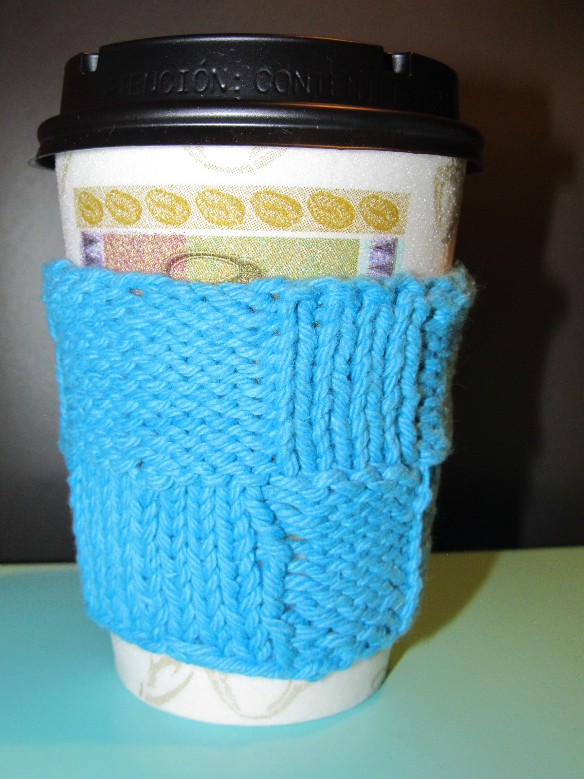 I don’t drink starbucks, but i’m told all their cups are the same in. This knit basket weave coffee cup cozy will keep your drink.