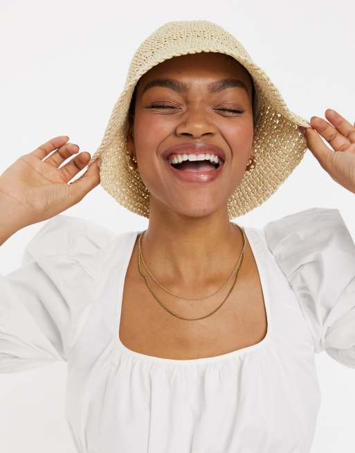 ASOS DESIGN crochet straw bucket hat in beige ASOS