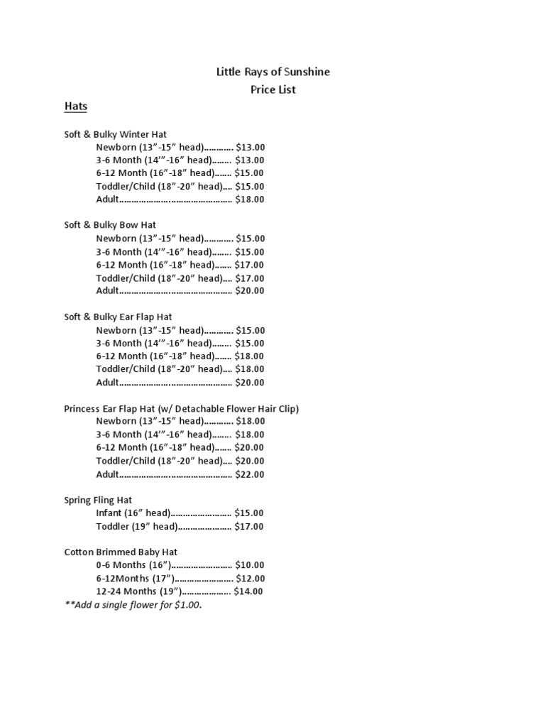 Crochet Price List PDF Fashion Accessories Headgear