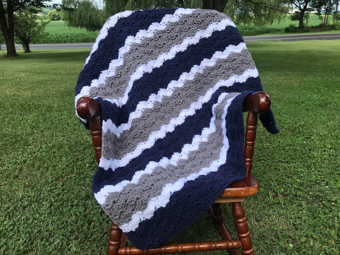 Blue and Gray Baby Blanket Handmade Crochet Striped Baby Etsy